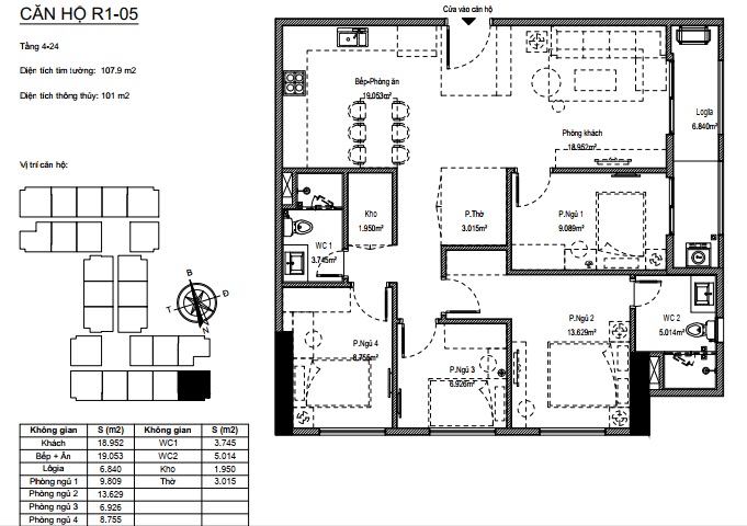 Căn hộ 101m2 trên mặt bằng từ tầng 4 đến tầng 24 có 2 căn hộ là căn R1-05 và R1-09 trên một mặt sàn.
