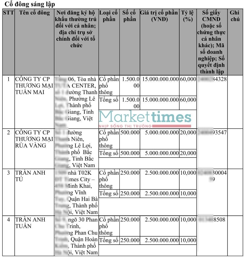 Trong đó, Công ty cổ phần thương mại Tuấn Mai được thành lập vào tháng 2/2007. Doanh nghiệp này ban đầu cũng có vốn điều lệ là 25 tỷ đồng.
